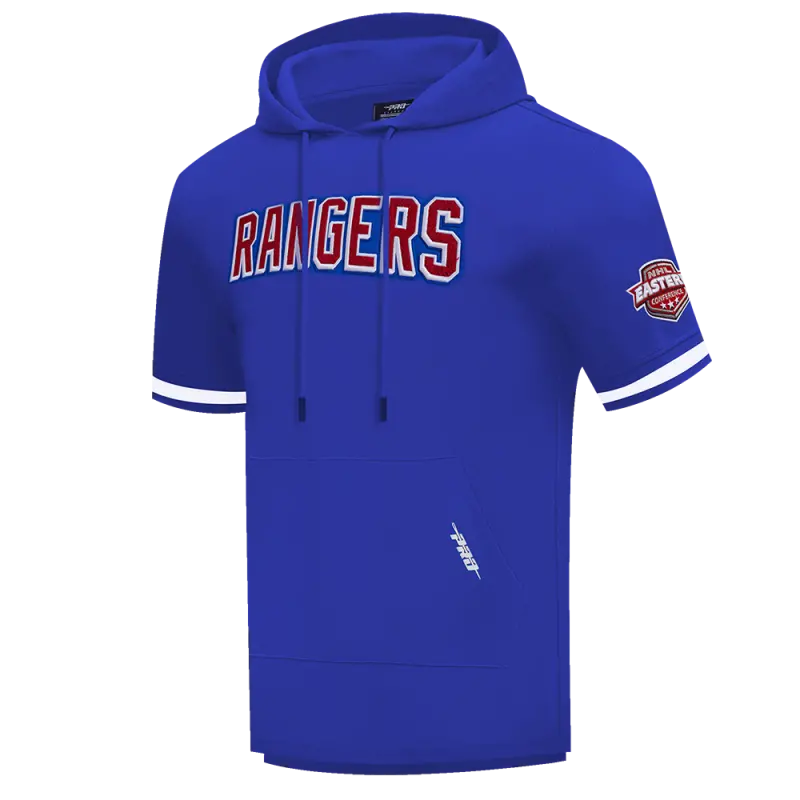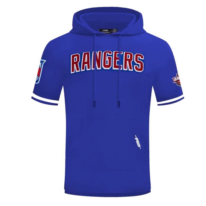 NHL NEW YORK RANGERS CLASSIC CHENILLE MEN’S DOUBLE KNIT SHORT SLEEVE PULLOVER HOODIE (ROYAL BLUE)