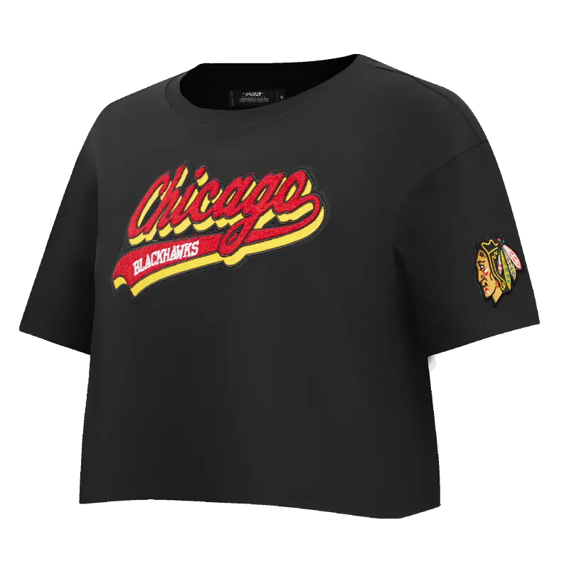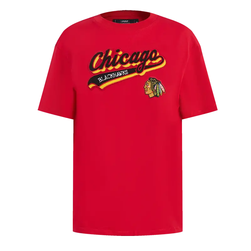 NHL CHICAGO BLACKHAWKS SCRIPT TAIL WOMEN’S SINGLE JERSEY BOXY TEE (BLACK)