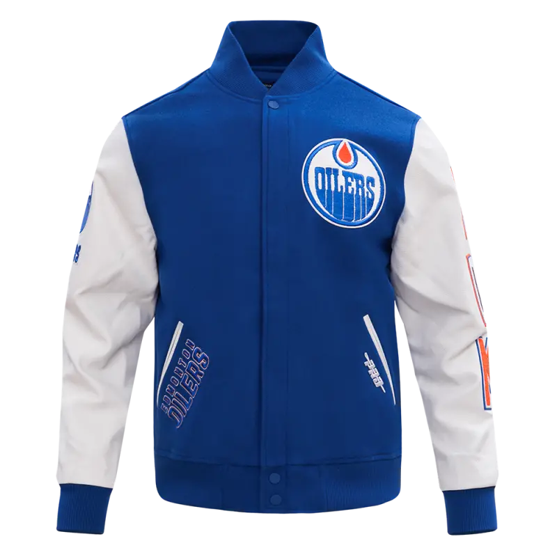 The Pro Standard Premium NHL Edmonton Oilers Classic Wool Men’s Varsity Jacket (Dodger Blue/White)