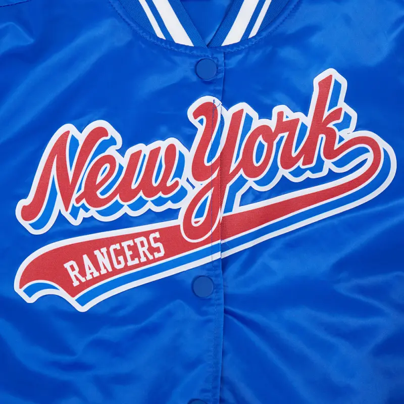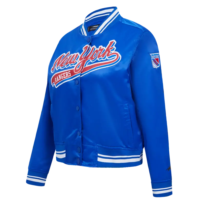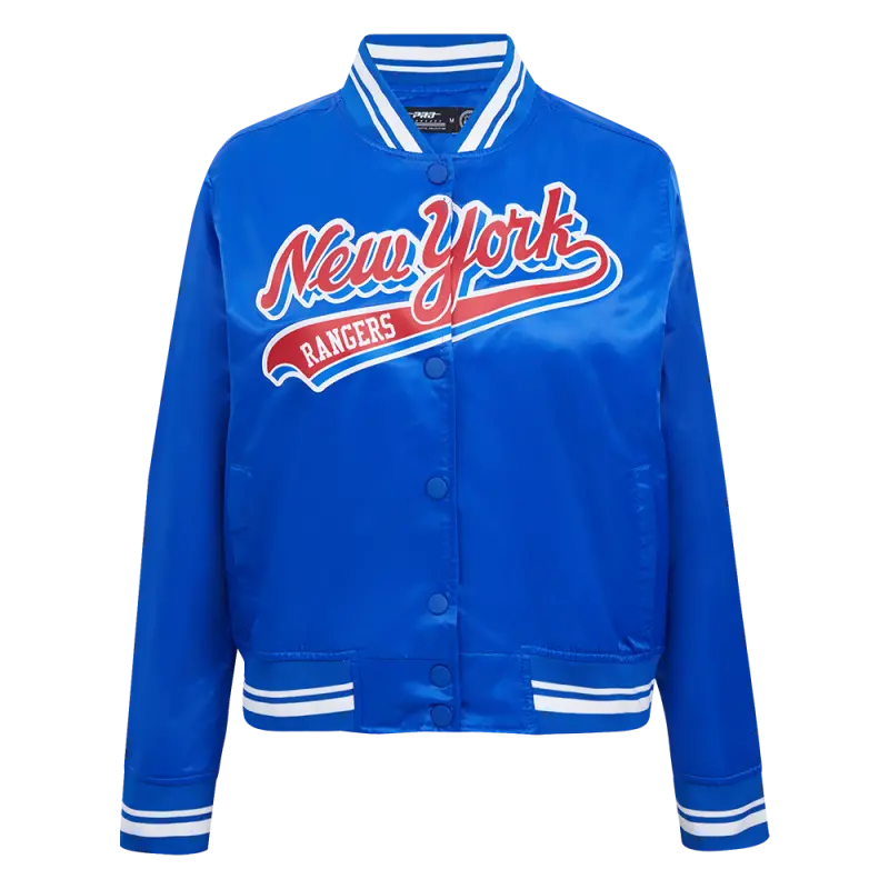 NHL NEW YORK RANGERS SCRIPT TAIL WOMEN’S SATIN JACKET (ROYAL BLUE)